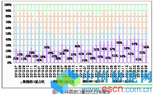 一是5月份從韓國進口多晶硅量達到4027噸,占當月總進口量的36.3%。1~5月份累計自韓國進口多晶硅19199噸,占累計總進口量的39.1%。韓國的主要出口企業(yè)OCI和韓國硅業(yè)(HankookSilicon)的稅率僅為2.4%和2.8%,反傾銷稅對其根本不造成任何影響,故韓國在2014年5月超過美國和德國,一躍成為最大的進口來源地,已經(jīng)連續(xù)一年保持首位。因此,自韓國進口量日漸攀升是導(dǎo)致進口量一再沖擊高點的主要原因?!吨袊?韓國自由貿(mào)易協(xié)定》于2015年6月1日在韓國首爾簽署,附件指出,若對韓國的制裁明顯存在主要企業(yè)稅率過低和反傾銷措施后傾銷加重的情況,在終裁執(zhí)行滿一年之后,可以按反傾銷規(guī)則對韓國企業(yè)的稅率適用提起復(fù)審,同時執(zhí)行加工貿(mào)易暫停政策,以保證反傾銷措施效果。因此,在符合法規(guī)的前提下重新審視對韓國反傾銷稅率勢在必行。