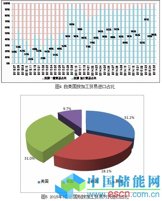 第二,5月份自美國按加工貿(mào)易方式進口多晶硅量為2311噸,占當月自美國進口總量的96.0%。可見,盡管美國企業(yè)的稅率都在50%以上,但實際上絕大部分通過加工貿(mào)易渠道進口規(guī)避反傾銷稅,其他以一般貿(mào)易方式進口部分為不在“雙反”征稅范圍的半導(dǎo)體用電子級多晶硅。因此美國通過加工貿(mào)易方式規(guī)避“雙反”是導(dǎo)致多晶硅進口量不斷攀升的另一重要因素。