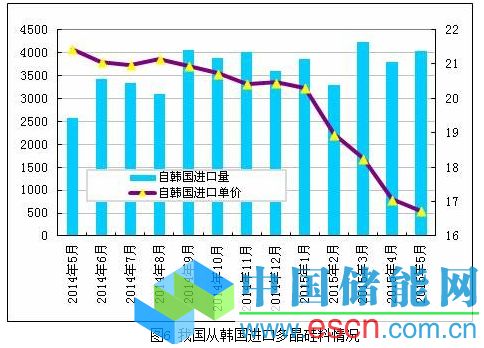 2015年5月份從韓國進口多晶硅量增加至4027噸,環(huán)比增幅為6.1%;5月份進口單價小幅下滑至16.74美元/千克,環(huán)比降幅為1.9%