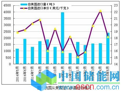 2015年5月份從美國進口多晶硅量大幅增加至2406噸,環(huán)比增幅為51.9%;5月份進口單價下滑至18.24美元/千克,環(huán)比降幅為17.9%。
