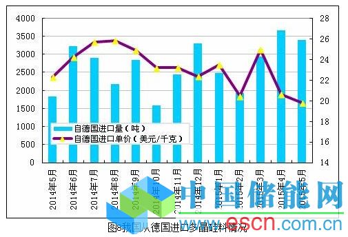 2015年5月份從德國進口多晶硅量減少至3402噸,環(huán)比降幅為7.2%;5月份進口單價下滑至19.78美元/千克,環(huán)比跌幅為4.1%。