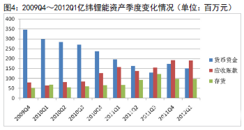 根據(jù)GBII統(tǒng)計(jì)數(shù)據(jù)顯示,公司貨幣資金由2009年第四季的3.46億元,減少至2012年第一季度的1.51億元(如圖4所示),這與公司營(yíng)業(yè)收入情況截然相反;這雖然有公司募投項(xiàng)目建設(shè)資金投入的原因,但更主要是公司存貨、應(yīng)收賬款占用了公司的大部分流動(dòng)資產(chǎn)。公司存貨由2009年末5164萬元增長(zhǎng)至2012年第一季度9746萬元,應(yīng)收賬款2009年末7837萬元增長(zhǎng)至2012年第一季度1.91億元(如圖4所示)。這些數(shù)據(jù)都表明億緯鋰能在快速發(fā)展過程中積聚了巨大的流動(dòng)性風(fēng)險(xiǎn)。