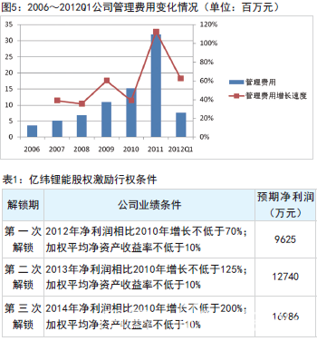 在給管理人員大幅加薪之后,是否能保持管理層的穩(wěn)定依然值得關(guān)注。首先,公司引進(jìn)人員在鋰電池領(lǐng)域從業(yè)經(jīng)驗(yàn)并不長(zhǎng),如:2012年3月新加入的鋰離子電池事業(yè)部負(fù)責(zé)人原從事磁帶機(jī)芯、DVD機(jī)芯的研究工作;其次,公司“家族”式管理的氛圍依然比較濃厚,能否為新進(jìn)管理人員提供一個(gè)寬松的工作環(huán)境還需要觀察;再次,公司為管理層量身定做了509.40萬股的激勵(lì)方案,但是其中460.65萬股是期權(quán),行權(quán)價(jià)格14.98元/股,行權(quán)條件也比較苛刻,每年凈利潤(rùn)增長(zhǎng)率要高于30%(如表1所示)。公司股權(quán)激勵(lì)方案可能為往后公司管理層動(dòng)蕩埋下隱患。