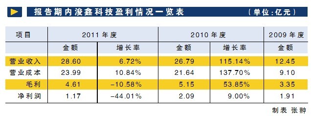 據(jù)浚鑫科技預(yù)披露招股書顯示,2009年、2010年和2011年?duì)I業(yè)收入分別為12.45億元、26.79億元和28.60億元,對應(yīng)年度的凈利潤分別為1.91億元、2.09億元和1.17億元。