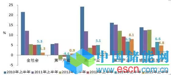 圖22010-2015年上半年全社會(huì)及各產(chǎn)業(yè)用電量增長(zhǎng)圖