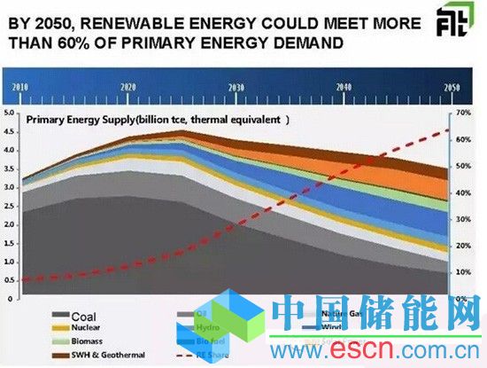 圖中反映了3個(gè)峰值:2020年中國(guó)煤炭消費(fèi)達(dá)到頂峰;2025年中國(guó)能源消費(fèi)總量達(dá)到頂峰45億噸標(biāo)煤(化石能源比例仍然很高),2030年中國(guó)二氧化碳排放達(dá)到頂峰(化石能源比例減小、可再生能源比例提高);2050年一次能源總量34億噸標(biāo)煤(上一版路線圖的目標(biāo)是50億噸),可再生能源占一次能源消費(fèi)的60%,非化石能源電力占總電力需求的91%,電力消費(fèi)比重從現(xiàn)在不到30%提高到60%。