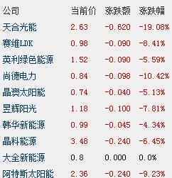 尚德電力、阿特斯太陽能、賽維LDK、昱輝陽光、晶科能源、英利綠色能源和晶澳太陽能跌幅均超過5%,評論認為,太陽能產業(yè)存在供求過多、需求不足、售價下降以及政府補助削弱等等問題。