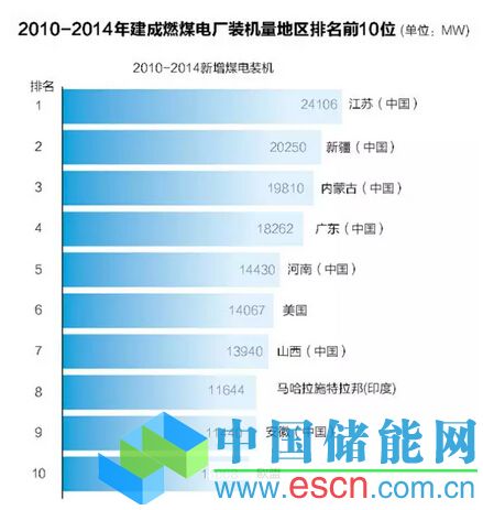 僅江蘇省,在2010年到2014年期間建成的燃煤裝機接近同期美國和歐盟建成燃煤電廠的裝機容量總和,達到24160MW。