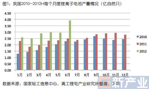 2012年1-6月,中國鋰離子電池產(chǎn)量達17.84億只,同比增長34.64%。其中,6月份的產(chǎn)量為3.92億只,同比增長50.06%,創(chuàng)近年來月度產(chǎn)量新高(圖1)。