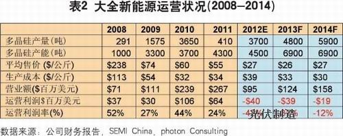 需求不振,從模組到多晶硅的價(jià)格也就失去了回穩(wěn)和反彈的基礎(chǔ)。以多晶硅價(jià)格為例,目前維持在27~28美元/公斤的長約價(jià)格和22~23美元/公斤的現(xiàn)貨市場價(jià)格在今年下半年要反彈到大約35美元/公斤以上的可能性微乎其微。因此,對于眾多生產(chǎn)成本在30-35美元/公斤的中國廠商來說,關(guān)閉工廠成了必然的選擇。當(dāng)然,市場需求(包括價(jià)格)和生產(chǎn)成本并不是決定企業(yè)生死存亡的唯一因素。中國一些有大型國營和民營集團(tuán)背景的多晶硅廠商有可能通過母公司或者銀行的財(cái)政支持,在虧本的情況下繼續(xù)維持一段時(shí)間,關(guān)鍵是虧本經(jīng)營的時(shí)間可以維持多久?表2顯示了大全新能源自2008年以來的運(yùn)營狀況以及一些機(jī)構(gòu)的預(yù)測。這一預(yù)測顯示,大全新能源在未來2~3年里有可能一直處于虧損狀態(tài),除非市場出現(xiàn)戲劇性好轉(zhuǎn)。公司的市場和經(jīng)營戰(zhàn)略轉(zhuǎn)型看來不可避免。