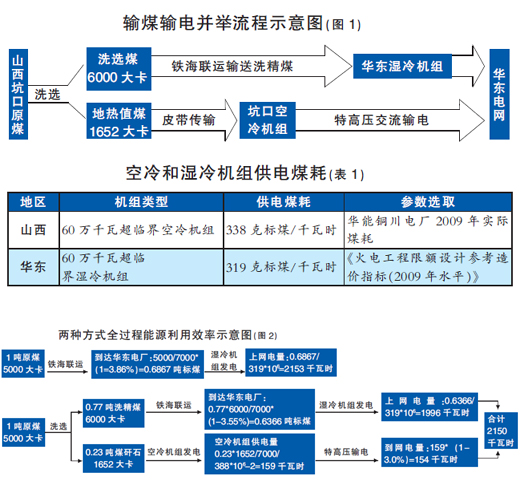 晉陜蒙寧新是我國主要的煤炭送端地區(qū)。研究表明,即使考慮到送端空冷機(jī)組煤耗相對較高,鐵海聯(lián)運(yùn)輸煤和輸煤輸電并舉的全程能源利用效率仍基本相當(dāng)。以山西——華東沿海為例分析如下。