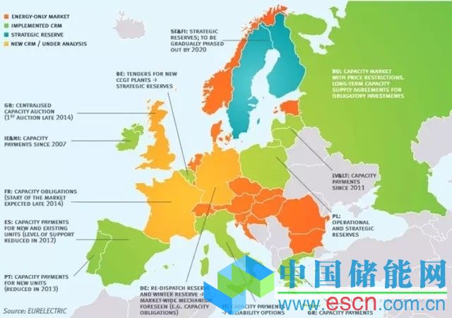 為此,人們?cè)O(shè)計(jì)了容量市場(chǎng)并形成了幾種不同的模式。以歐洲為例,就有法國(guó)的強(qiáng)制容量備用體制,西班牙的戰(zhàn)略補(bǔ)償體制,英國(guó)的集中容量拍賣(mài)等幾種不同的模式。在歐盟的ACER監(jiān)管中心網(wǎng)站上,我們可以找到如下的一張全歐的不同容量市場(chǎng)體制的分布圖。