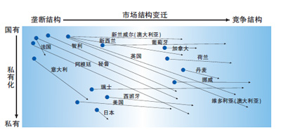 大致而言,電力工業(yè)生產(chǎn)關(guān)系總的變革軌跡是從私有、自由發(fā)展、小地域壟斷,到國有、全面管制、大地域壟斷,再到私有、部分管制、大地域競爭。但是各個(gè)國家又各有一些差異,第一輪的國有化運(yùn)動(dòng),主體在歐洲,美日等國沒有國有化,但所有的國家都無一例外地對(duì)電力工業(yè)執(zhí)行政府干預(yù)、全面管制,實(shí)施特許專營,所以其一個(gè)共同的結(jié)果就是電力商品屬性的湮沒。第二輪的自由化運(yùn)動(dòng),主題詞是放松管制、交易市場化、價(jià)格自由化,私有化只能算是一個(gè)附加選做題。