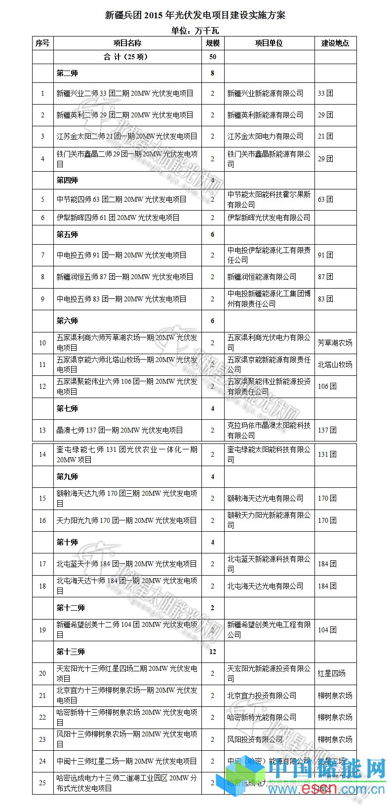 中國(guó)儲(chǔ)能網(wǎng)訊:在綜合考慮2014年項(xiàng)目建設(shè)情況、電力市場(chǎng)條件等因素的基礎(chǔ)上,2015年,新疆兵團(tuán)將50萬(wàn)千瓦發(fā)電規(guī)模安排予25個(gè)光伏電站項(xiàng)目,具體名單見(jiàn)下表: