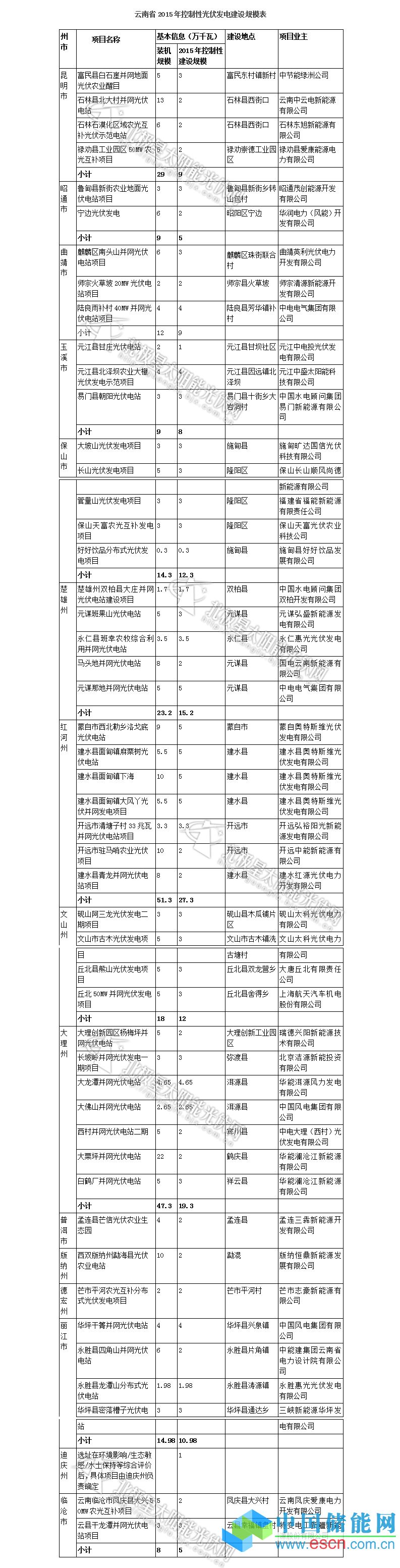 中國(guó)儲(chǔ)能網(wǎng)訊:2015年,云南省擬以140萬(wàn)千瓦光伏電站建設(shè)規(guī)模分配各州市控制性光伏電站建設(shè)規(guī)模,覆蓋49個(gè)光伏電站項(xiàng)目,具體名單見(jiàn)下表:
