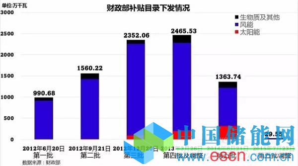 不多說(shuō)直接上圖,這是最新的補(bǔ)助目錄發(fā)放情況,若不計(jì)2015年7月下發(fā)的第五批調(diào)整目錄,補(bǔ)助目錄已經(jīng)1年沒(méi)有更新。從裝機(jī)容量來(lái)看,已列入目錄的太陽(yáng)能及風(fēng)能項(xiàng)目合計(jì)8118萬(wàn)千瓦,然而截2015至6月末,太陽(yáng)能及風(fēng)能項(xiàng)目合計(jì)14069萬(wàn)千瓦,意味著約有5000多萬(wàn)千瓦的項(xiàng)目因沒(méi)有列入目錄而拿不到補(bǔ)貼。(全國(guó)并網(wǎng)風(fēng)電裝機(jī)容量10491萬(wàn)千瓦,全國(guó)光伏發(fā)電裝機(jī)容量3578萬(wàn)千瓦,光伏電站3007萬(wàn)千瓦,分布式光伏571萬(wàn)千瓦。)