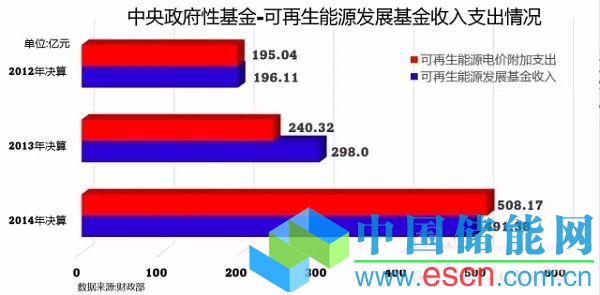 2014年中央財(cái)政可再生能源發(fā)展基金收入的基金只有不到500億元的規(guī)模,相比高速增長(zhǎng)的可再生能源裝機(jī),基金的缺口越來(lái)越大。
