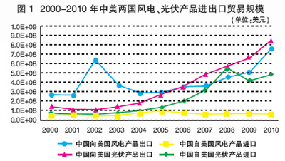 進(jìn)入21世紀(jì),中美兩國在新能源產(chǎn)品開發(fā)領(lǐng)域都取得了巨大成果,由于各自發(fā)展優(yōu)勢(shì)不同,兩國之間的新能源貿(mào)易規(guī)模近年增速明顯。統(tǒng)計(jì)數(shù)據(jù)顯示,2010年美國從中國進(jìn)口新能源產(chǎn)品總額達(dá)到36.01億美元,出口總額為32.22億美元,年均增速分別達(dá)到了29.16%和22.86%,其中風(fēng)電產(chǎn)業(yè)和光伏產(chǎn)業(yè)產(chǎn)品規(guī)模比重占到了近40%。風(fēng)電產(chǎn)業(yè)方面,目前我國已成為亞洲第一、全球第二的風(fēng)電大國,2010年中美之間的風(fēng)電產(chǎn)品設(shè)備貿(mào)易規(guī)模達(dá)5.64億美元,年均增速更是達(dá)到了26.95%,但從進(jìn)出口差額來看,我國一直處于順差地位且貿(mào)易差額逐年擴(kuò)大,表明我國的風(fēng)電產(chǎn)業(yè)發(fā)展較為強(qiáng)勢(shì)(圖1);光伏產(chǎn)業(yè)方面,近年中美光伏產(chǎn)品貿(mào)易規(guī)模也保持了近28%的年均增速,2010年已達(dá)25.27億美元,其中中國對(duì)美國出口增速比進(jìn)口高出10多個(gè)百分點(diǎn)的測(cè)算結(jié)果證明了中國光伏電池企業(yè)向美國出口增加的事實(shí)(圖1)??偨Y(jié)來看,同樣作為世界數(shù)一數(shù)二的能源消費(fèi)大國,中國新能源產(chǎn)業(yè)至少在初期表現(xiàn)出了比美國更快的發(fā)展速度,尤其是在風(fēng)電及光伏產(chǎn)業(yè)方面,而這也正是令美國新能源企業(yè)感到競(jìng)爭(zhēng)危機(jī)進(jìn)而發(fā)起貿(mào)易保護(hù)的主要原因之一。