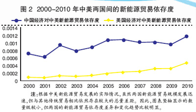 圖2是2000-2010年中美兩國經(jīng)濟(jì)分別對(duì)兩國間新能源貿(mào)易依存度的比較分析結(jié)果,測(cè)算表明:首先,雖然中美兩國的依存度在個(gè)別年份(如2001和2003年)都有小幅波動(dòng),但整體均展現(xiàn)出比較明顯的快速攀升趨勢(shì);其次,作為近十年才開始發(fā)展的新能源貿(mào)易,其規(guī)模與傳統(tǒng)貿(mào)易相比依然存在較大差距,因此所體現(xiàn)出的經(jīng)濟(jì)依存度絕對(duì)量較低,但長期的增長趨勢(shì)表明中美兩國間的新能源貿(mào)易在各自經(jīng)濟(jì)發(fā)展中的地位愈加重要;第三,相比較而言,中國經(jīng)濟(jì)對(duì)中美兩國間新能源貿(mào)易的依存程度明顯大于美國,主要原因在于當(dāng)前中國的經(jīng)濟(jì)總量規(guī)模要遠(yuǎn)低于美國的經(jīng)濟(jì)總量。