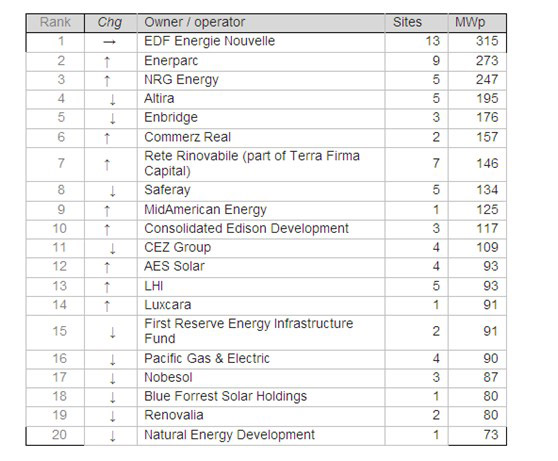 2010年以來(lái)排在首位的是法國(guó)電力公司EDF,而加利福尼亞州的公營(yíng)Pacific Gas and Electric在其Utility Owned Generation (UOG)計(jì)劃中也有一個(gè)產(chǎn)品組合。但是,名單包括更多獨(dú)立電力生產(chǎn)商(IPP),如NRG能源公司、加拿大的Enbridge公司和意大利的Rete Rinovabile(RTR)。其他主要的商家是純粹的金融投資者,包括沃倫·巴菲特旗下的MidAmerican Energy Holdings;和其他的太陽(yáng)能項(xiàng)目開(kāi)發(fā)商,他們保留了自己的項(xiàng)目組合,如Enerparc、Saferay和AES Solar。