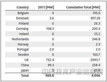 資料2.全球海上風力發(fā)電裝機容量(2011年,累計)(出處) GWEC – Global Wind 2011 Report