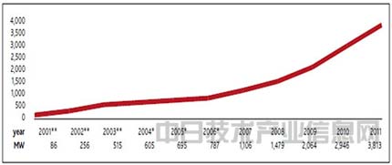 其中海上發(fā)電設(shè)備一年設(shè)置了97萬千瓦,到2011年年底累計設(shè)置410萬千瓦。在410萬千瓦中,有381萬千瓦設(shè)置于歐盟。剩余的基本是中國進行的實證業(yè)務,歐盟創(chuàng)造了海上風力發(fā)電的歷史。資料1表示了歐盟海上風力發(fā)電裝機容量的變化,可以看出正順利增長。