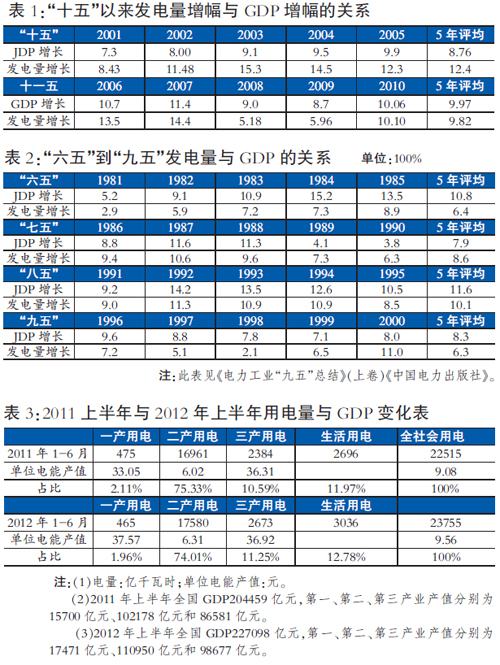 社會(huì)方方面面之所以有這種質(zhì)疑,緣于沒有全面了解我國改革開放以來用電量與GDP的關(guān)系。這些讀者都認(rèn)為,我國用電量增幅高于GDP增幅理所當(dāng)然,一旦某一年份用電量增幅低于GDP增幅就認(rèn)為不正常。這是為什么呢?這是因?yàn)樽?000年到2011年的11間,其中9個(gè)年頭我國用電量增幅是高于GDP增幅的,而且11年內(nèi)用電量年平均增幅也是高于GDP的(見表1)。殊不知,我國自改革開放以來,有很多年份用電量增幅是低于GDP增幅的。如1978年至2000年21年間,我國用電量大部分年份增幅是低于GDP的,而且年均用電量增幅也是低于GDP增幅的。比如“六五”時(shí)期GDP平均增幅為10.8%,而用電量平均增幅為6.4%;“七五”時(shí)期GDP增幅為8.6%,用電量增幅為9.1%;“八五”時(shí)期增幅為11.6%,用電量增幅為10.1%;“九五”時(shí)期GDP增幅為8.3%,用電量增幅為6.3%。從“六五”到“九五”的20年時(shí)間內(nèi),只有“七五”的用電量增幅高于同期的GDP增幅,其余15年都是用電量增幅低與GDP增幅的,而且這20年用電量平均增幅也是低于GDP增幅的(見表2)。