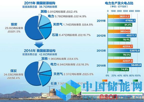 同期火電裝機(jī)容量達(dá)到9.47億千瓦,“十二五”末期,我國(guó)火電占總裝機(jī)已降至67%以下,比2013年的69%微降2個(gè)百分點(diǎn)以上。 從電力消費(fèi)來(lái)看,2014年我國(guó)電力消費(fèi)量達(dá)56495.8億千瓦時(shí),相當(dāng)于6.94億噸標(biāo)準(zhǔn)煤。在能源結(jié)構(gòu)中,電力占比已達(dá)16.3%,比2011年增加了1.4個(gè)百分點(diǎn)。其中火力發(fā)電量自2013年以來(lái)呈逐年遞減態(tài)勢(shì),火電占發(fā)電量比重也有大幅度下降,說明清潔能源的發(fā)電量在不斷增長(zhǎng)。