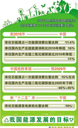 四、大力發(fā)展新能源和可再生能源。到2015年,非化石能源消費(fèi)占一次能源消費(fèi)比重將達(dá)到11.4%,非化石能源發(fā)電裝機(jī)比重達(dá)到30%。其中,2015年,水電裝機(jī)容量2.9億千瓦;運(yùn)行核電裝機(jī)容量4000萬千瓦;風(fēng)電裝機(jī)突破1億千瓦,其中海上風(fēng)電裝機(jī)500萬千瓦;太陽能發(fā)電裝機(jī)容量2100萬千瓦以上,太陽能集熱面積達(dá)到4億平方米;建成1000個(gè)左右天然氣分布式能源項(xiàng)目,以及10個(gè)左右各類典型特征的分布式能源示范區(qū)域。