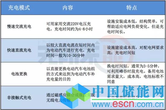 目前電動汽車的充電方式主要包括慢速交流充電、快速直流充電、電池更換和非接觸式充電(無線充電)四類,特點(diǎn)如下圖: