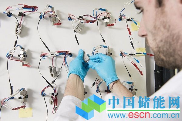 研究人員正在接入測試一塊鈉離子電池。