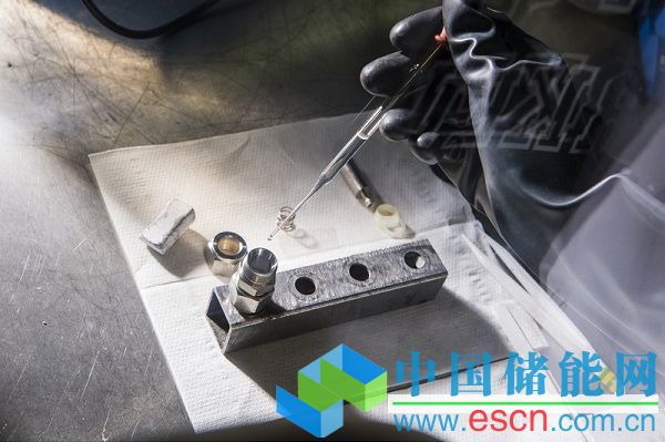 組裝一塊電池以測試鈉離子電池材料(由于金屬鈉性質(zhì)活潑,操作者做好了包括手套在內(nèi)的‘全副武裝’)。