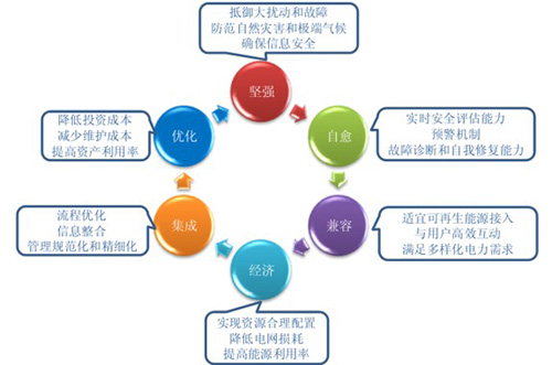 智能電網(wǎng)主要有堅強、自愈、兼容、經(jīng)濟、集成、優(yōu)化等特征。堅強的特征表現(xiàn)在能夠抵御大擾動和故障、防范自然災害和極端氣候、確保信息安全;自愈的特征表現(xiàn)在實時的安全評估能力、預警機制、故障診斷和自我修復能力;兼容的特征表現(xiàn)在適宜可再生能源和分布式電源接入、與用戶高效互動、滿足多樣化電力需求;經(jīng)濟的特征表現(xiàn)在實現(xiàn)資源合理配置、降低電網(wǎng)損耗、提高能源利用率;集成的特征表現(xiàn)在實現(xiàn)電網(wǎng)信息的高度融合和共享;優(yōu)化的特征表現(xiàn)在降低投資成本和維護成本。