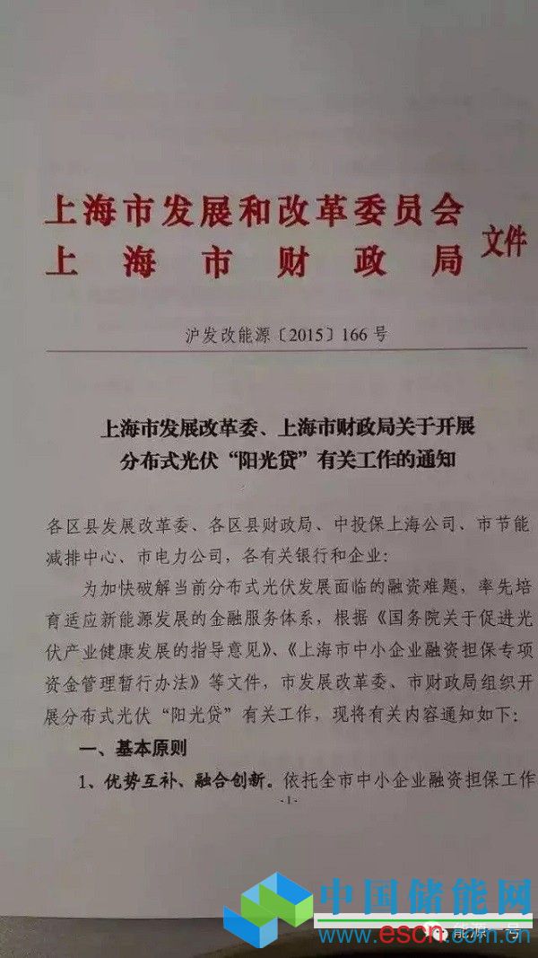 12月16日下午,“能源一號(hào)”從權(quán)威部門獲得確認(rèn),上海市發(fā)改委聯(lián)合上海市財(cái)政局已發(fā)布了一則文件,通過“陽光貸”這一新政力促解決分布式光伏的貸款問題。