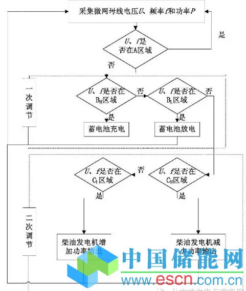 (3)若U、f處于A區(qū)域,則蓄電池儲能系統(tǒng)和柴油發(fā)電機(jī)組不參與調(diào)節(jié);若U、f處于B區(qū)域,負(fù)責(zé)一級控制的蓄電池儲能系統(tǒng)參與調(diào)節(jié)以實(shí)現(xiàn)系統(tǒng)功率平衡;若U、f處于C區(qū)域,則二級控制的柴油發(fā)電機(jī)參與調(diào)節(jié)以實(shí)現(xiàn)系統(tǒng)功率平衡;