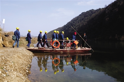 安徽省池州市東至縣山區(qū)線路段,巡線小分隊(duì)乘坐擺渡船過(guò)河進(jìn)山巡查線路。