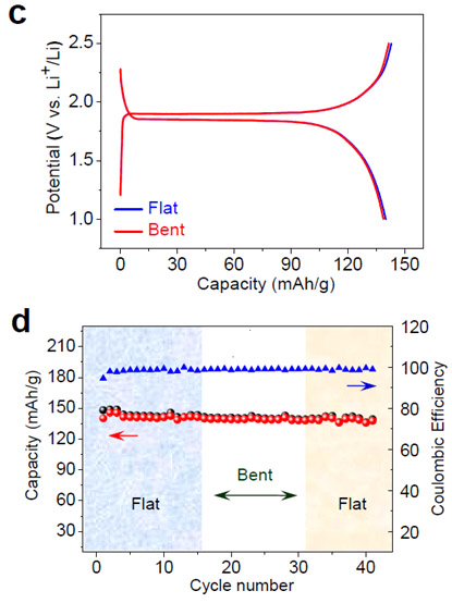 圖1 制備的柔性鋰離子全電池及其電化學(xué)性能。(a)基于三維石墨烯網(wǎng)絡(luò)結(jié)構(gòu)的柔性鋰離子電池的實(shí)物照片;(b) 柔性鋰離子電池在彎曲狀態(tài)下為發(fā)光二極管供電;在彎曲與未彎曲狀態(tài)下柔性鋰離子電池的(c)充放電曲線和(d)循環(huán)性能圖,在彎曲狀態(tài)下電池的容量保持不變