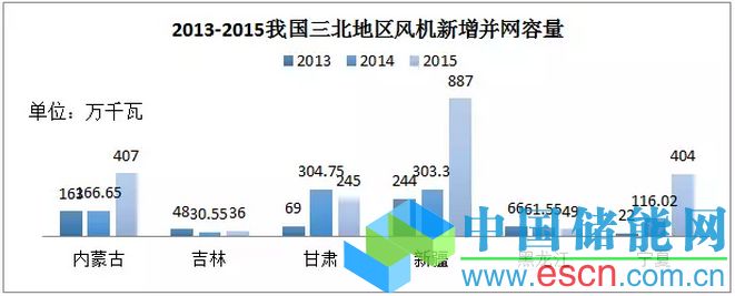 從三北地區(qū)風(fēng)電新增并網(wǎng)容量上看,三北地區(qū)棄風(fēng)率升高與近年來(lái)三北地區(qū)風(fēng)機(jī)并網(wǎng)容量大幅增長(zhǎng)也存在著部分關(guān)系。近3年來(lái),我國(guó)三北地區(qū)風(fēng)電并網(wǎng)容量增長(zhǎng)趨勢(shì)明顯,較2014年,除了甘肅、吉林2015年新增并網(wǎng)容量有小幅度下降以外,其余省(自治區(qū))新增并網(wǎng)容量均大幅提升,特別是內(nèi)蒙古、新疆、寧夏三地,2015年新增并網(wǎng)容量是2014年并網(wǎng)容量的2倍多。