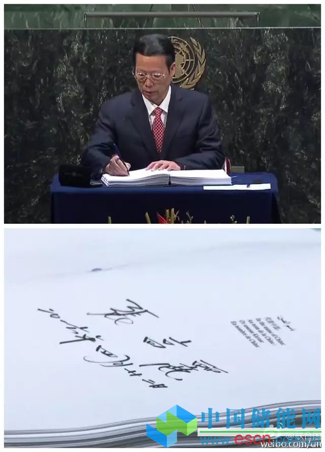 圖為中國國務(wù)院副總理張高麗作為習近平主席特使在《巴黎協(xié)定》上簽字。(來自@聯(lián)合國 官方微博)