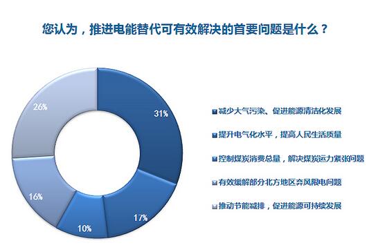 調(diào)查結(jié)果顯示,環(huán)境污染無疑是大家極為關(guān)心的問題。針對推進電能替代可有效解決的首要問題,31%的受訪者認為,電能替代將有效減少大氣污染、促進能源清潔化發(fā)展;26%的受訪者認為,推動節(jié)能減排、促進能源可持續(xù)發(fā)展;16%的受訪者認為,有效緩解部分北方地區(qū)棄風限電問題。其他受訪者認為電能替代可有效解決提升電氣化水平、提高人民生活質(zhì)量和控制煤炭消費總量、解決煤炭運力緊張問題。