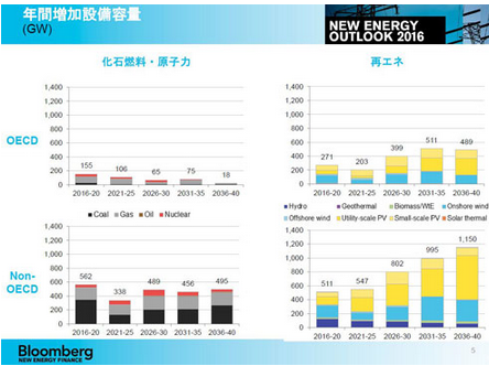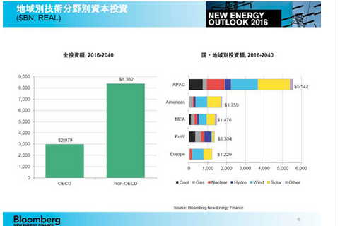 由此,2040年各類電源在整體發(fā)電容量中所占的比例將由2015年的光伏發(fā)電4%、風(fēng)力發(fā)電7%,大幅增至光伏發(fā)電為29%、風(fēng)力發(fā)電為13%。