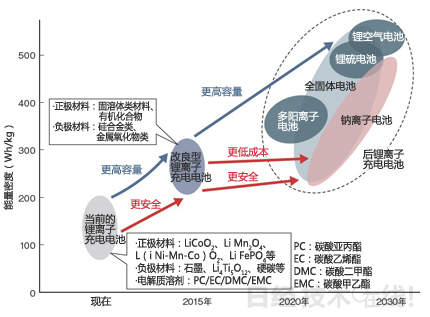 目前推進的材料開發(fā)的目標是,2020年在確保安全性的同時使能量密度達到300Wh/kg。2030年使Li-S電池和鋰空氣電池等500Wh/kg以上的新一代電池實現(xiàn)實用化。