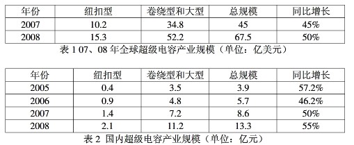 表1、表2是對(duì)三種超級(jí)電容器產(chǎn)業(yè)規(guī)模進(jìn)行調(diào)查而得到的數(shù)據(jù)整理而成的,分別反映了世界和中國(guó)超級(jí)電容器產(chǎn)業(yè)的情況。從這兩個(gè)表中我們不難發(fā)現(xiàn)三個(gè)問題: