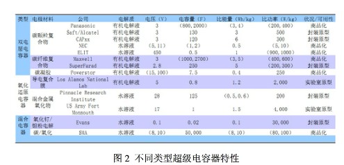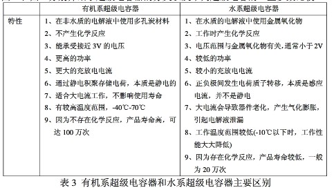 表3列出了有機(jī)系超級(jí)電容器和水系超級(jí)電容器的一些特性上的主要區(qū)別。
