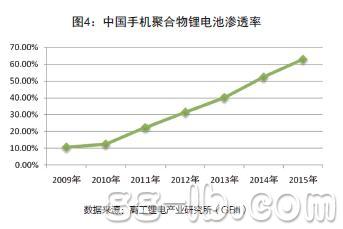 據(jù)高工鋰電產(chǎn)業(yè)研究所(G B I I)統(tǒng)計(jì),2 0 0 9年,聚合物鋰離子電池在手機(jī)電池中的應(yīng)用比例為10.7%,而到2012年,聚合物鋰離子電池的應(yīng)用比例已經(jīng)達(dá)到了32.5%。預(yù)計(jì)在未來的幾年中,隨著國內(nèi)3G市場的逐步成熟,以及智能手機(jī)滲透率的快速上升,聚合物鋰離子電池將是未來手機(jī)電池中的主流,而相應(yīng)的也將帶動其市場滲透率的快速上升。到2015年,聚合物鋰離子電池在手機(jī)中的應(yīng)用比例將達(dá)到63.5%。(圖4)
