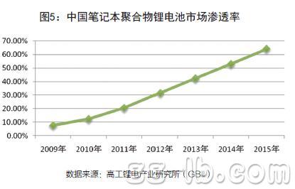 據(jù)高工鋰電產(chǎn)業(yè)研究所(GBII)統(tǒng)計(jì),2009年全球筆記本電池采用聚合物電池的比例僅為7.6%。到2012年,聚合物鋰離子電池在筆記本電腦中的滲透率已經(jīng)達(dá)到了31.5%。預(yù)計(jì),聚合物鋰離子電池的市場滲透率在2015年將達(dá)到64%。(圖5)聚合物鋰離子電池作為未來幾年數(shù)碼電池發(fā)展的方向,這將給鋰電池的發(fā)展帶來很大的影響。因?yàn)?,在動力鋰電池、大型儲能市場還未大規(guī)模打開的情況下,手機(jī)電池仍然將作為鋰電池的最為主要的應(yīng)用領(lǐng)域。同時,手機(jī)鋰電池應(yīng)用結(jié)構(gòu)的變化,將毫無疑問給其他數(shù)碼產(chǎn)品鋰電池的的應(yīng)用結(jié)構(gòu)帶來影響。