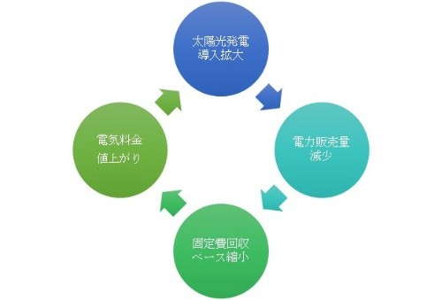 即,促進(jìn)自產(chǎn)自消的凈計(jì)量電價(jià)制度會(huì)增加分散型光伏發(fā)電系統(tǒng)的導(dǎo)入。隨著光伏發(fā)電的增加,電力公司的電力銷售總量會(huì)進(jìn)一步降低。能回收電價(jià)中包含的送配電網(wǎng)維護(hù)固定費(fèi)用的客戶基數(shù)縮少,因此電力公司會(huì)提高電價(jià)。隨著漲價(jià),未設(shè)置光伏發(fā)電系統(tǒng)的電力用戶為了削減電費(fèi)會(huì)導(dǎo)入光伏發(fā)電系統(tǒng)。這樣,客戶群進(jìn)一步減少,電力公司又會(huì)再次漲價(jià),如圖1。