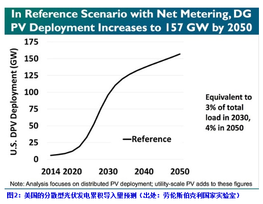 LBNL預(yù)測(cè),如果繼續(xù)應(yīng)用現(xiàn)在的與零售電力為同等價(jià)格的凈計(jì)量電價(jià)制度,美國(guó)的分散型光伏發(fā)電市場(chǎng)(與配電網(wǎng)連接的住宅用及商業(yè)、公共、工業(yè)用系統(tǒng))2050年累計(jì)將擴(kuò)大至157GW。相當(dāng)于美國(guó)總電力需求的4%。并以該預(yù)測(cè)作為“參考值(reference)”,分析了“固定費(fèi)用回收(電價(jià)漲價(jià))”和“按時(shí)段收費(fèi)”兩種制度(圖2)。