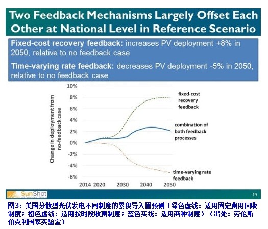 LBNL分析認(rèn)為,適用“固定費(fèi)用回收”制度時(shí),2050年的光伏發(fā)電導(dǎo)入量與參考值相比會(huì)提高8%;而適用“按時(shí)段收費(fèi)”制度的話,則會(huì)比參考值減少5%(圖3)。