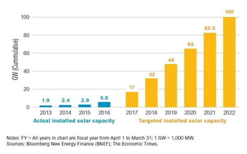 從圖表中可看出,想要實現(xiàn)2022年100GW的目標,印度需要將自己的生產(chǎn)能力從每年裝機4GW的水平提升到每年15GW。難度系數(shù)有些大?國際投資大鱷們可不覺得。